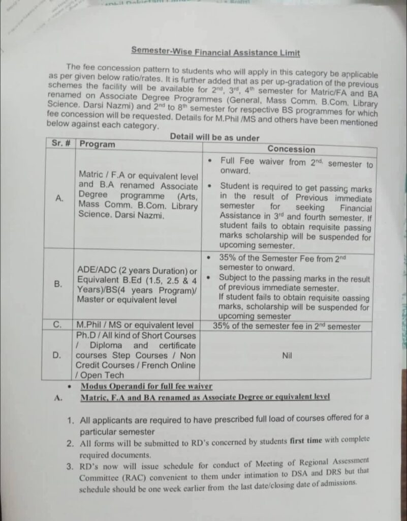 The fee concession pattern to students who will apply in this category be applicable as per given below ratio/rates. It is further added that as per up-gradation of the previous schemes the facility will be available for 2nd, 3rd, 4th semester for Matric/FA and BA renamed on Associate Degree Programmes (General, Mass Comm. B.Com. Library Science. Darsi Nazmi) and 2nd to 8th semester for respective BS programmes for which fee concession will be requested. Details for M.Phil /MS and others have been mentioned below against each category.