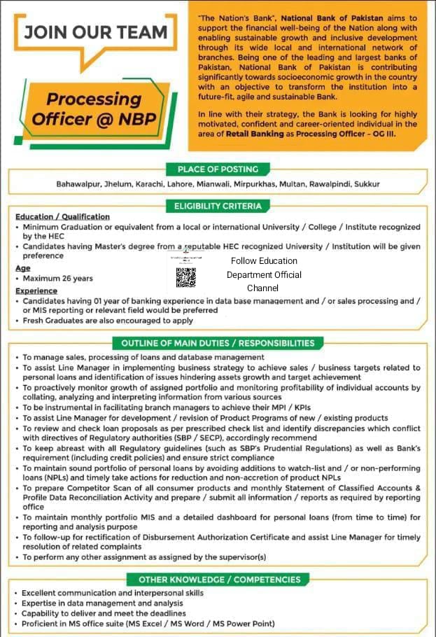 🔹 Jobs in National Bank of Pakistan (NBP) 🚨 Last Date : 22 January,2026☑️14 year education☑️Age 26 years☑️Fresh candidates can applyTo get free information about all govt & private Jobs Follow Education Department Official Channel Right now