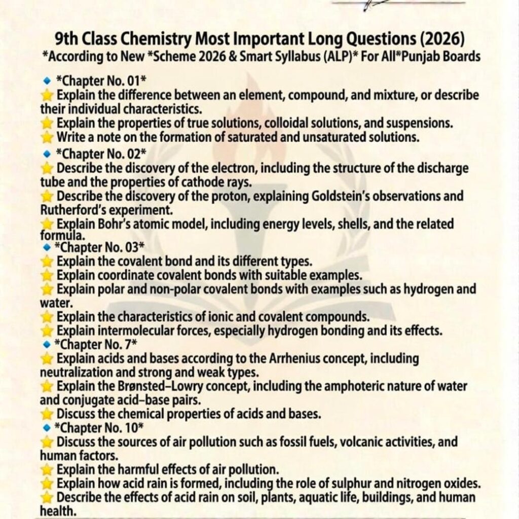 *9th Class Chemistry Most Important Long* *Questions (2026)**According to New* *Scheme 2026 & Smart* *Syllabus (ALP)* *For All* *Punjab Boards*