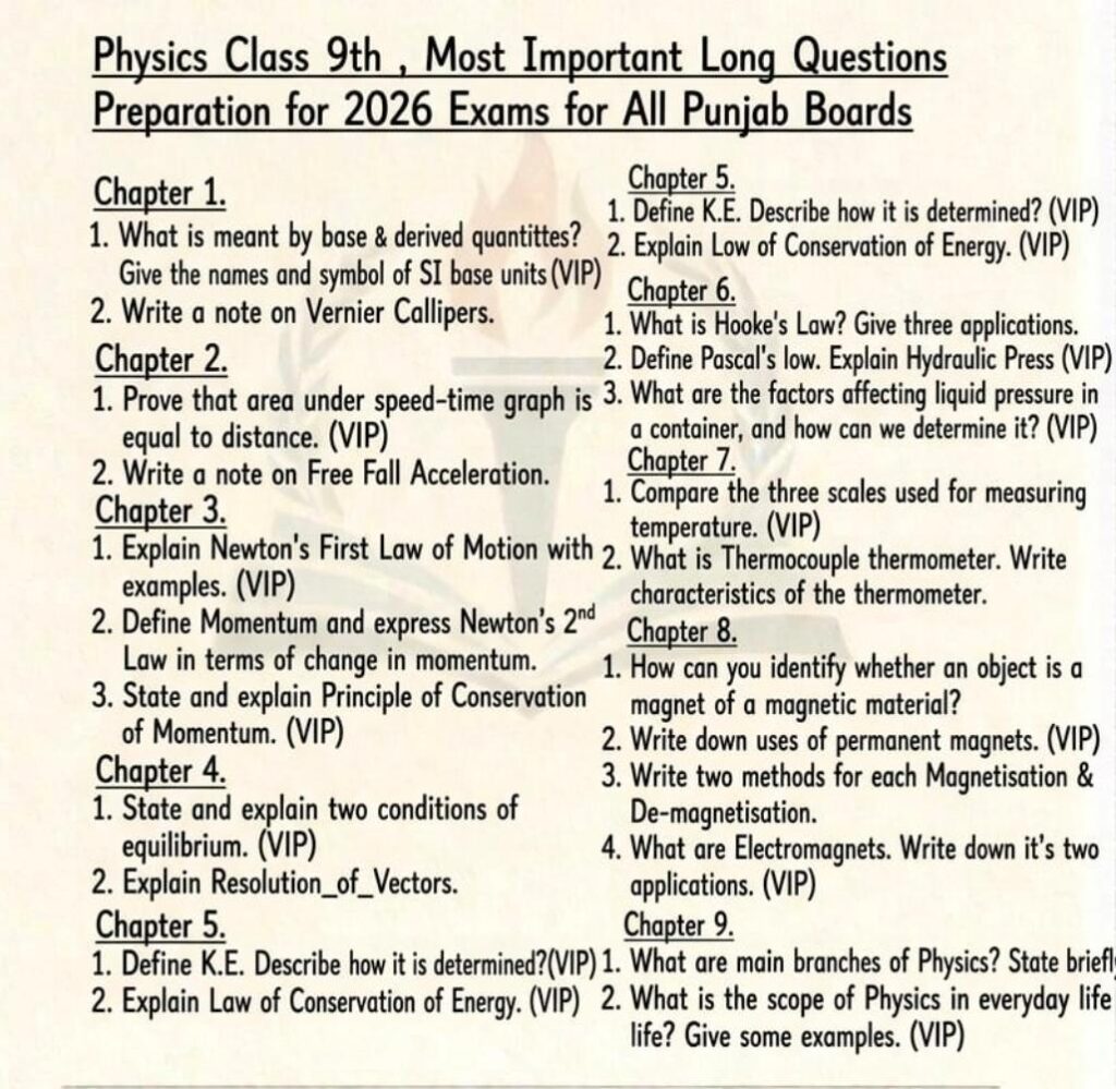 9th Class Physics Guess paper 2026