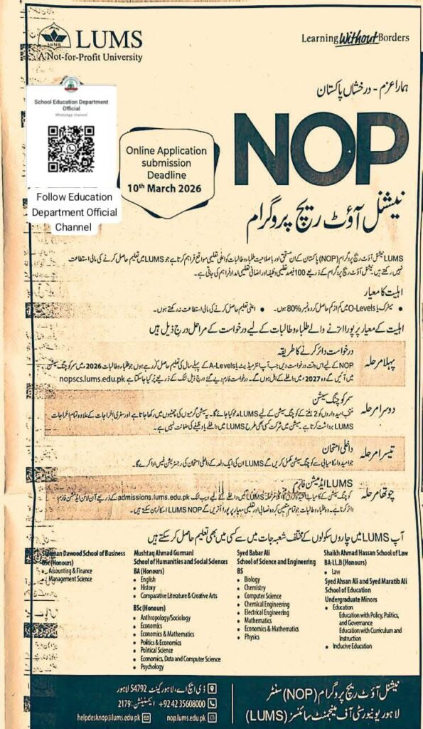 اگر آپ ذہین ہیں، محنتی ہیں لیکن مالی وسائل محدود ہیں تو LUMS کا NOP اسکالرشپ آپ کے لیے ہے۔ اس پروگرام کے ذریعے طلبہ کو 100% فیس اسکالرشپ اور اضافی مالی معاونت فراہم کی جاتی ہے۔