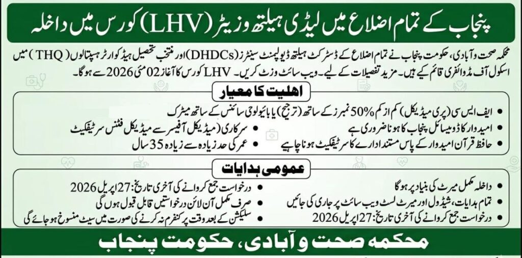 پنجاب کے تمام اضلاع میں LHV کورس میں داخلے جاری ہیں