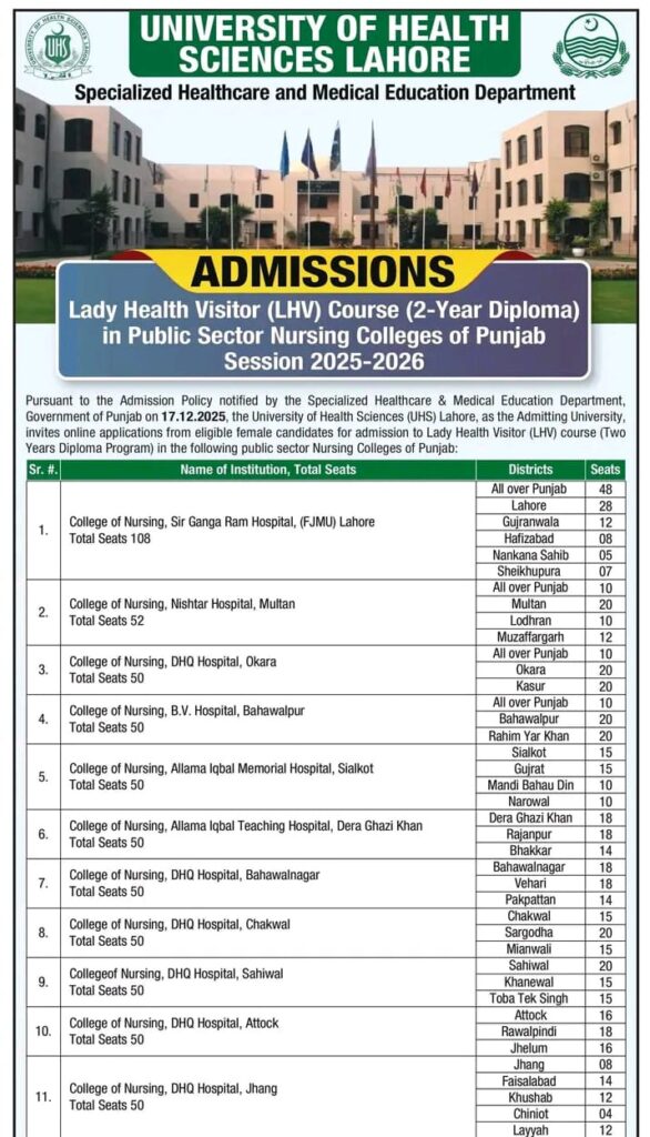 یونیورسٹی آف ہیلتھ سائنسز (UHS) لاہور کی طرف سے پنجاب کے گورنمنٹ سیکٹر نرسنگ کالجز میں لیڈی ہیلتھ وزیٹر کے داخلے براۓ سیشن 2025-26 (پارٹ 1/2)