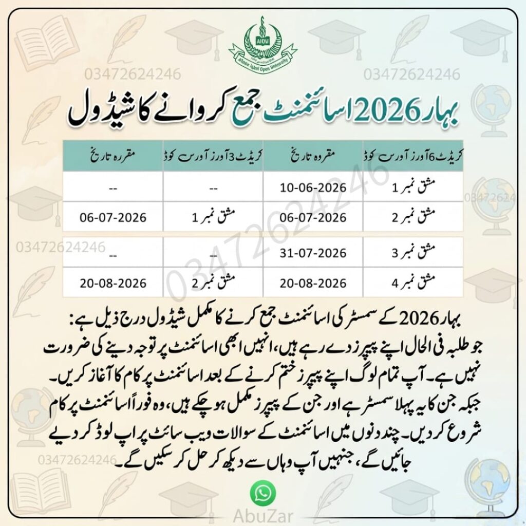 Aiou MATRIC,FA,BA, Assignment submission schedule for spring 2026