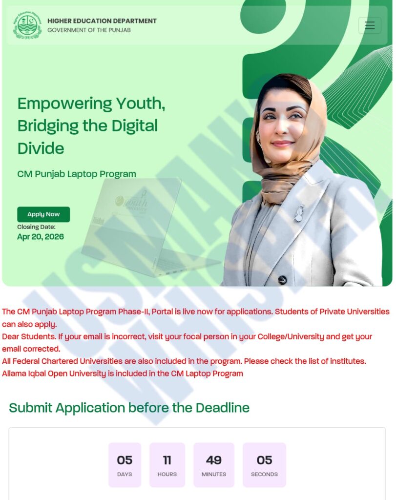 حکومتِ پنجاب نے وزیرِ اعلیٰ پنجاب لیپ ٹاپ پروگرام کے تحت درخواستوں کی آخری تاریخ میں ایک بار پھر توسیع کر دی ہے۔ طلبہ اب 20 اپریل 2026 تک اپنی درخواستیں جمع کرا سکتے ہیں۔