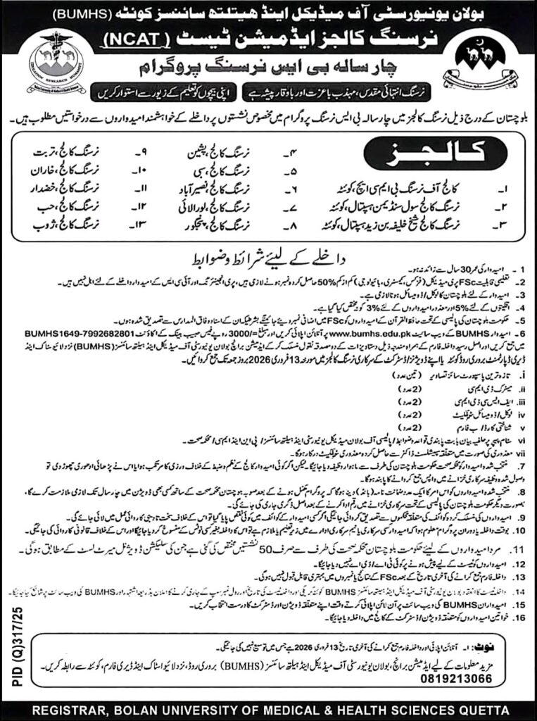 ⭕Bolan University of Medical & Health Sciences (BUMHS), QuettaNursing Colleges Admission Test (NCAT) for Admission in BS Nursing (4-Year) Program in 13 Govt Nursing Colleges of Balochistan Session 2026