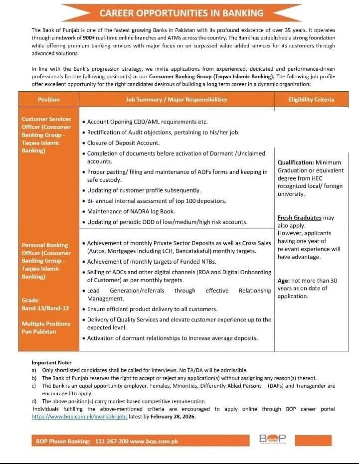 بینک آف پنجاب BOP میں آسامیاں