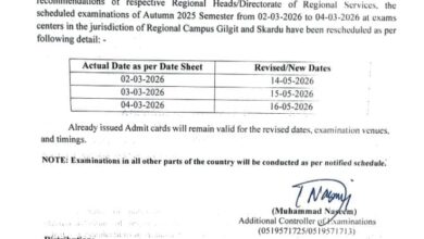 Important Notice for Students of Gilgit-Baltistan and Skardu All three papers from March 2 to March 4 have been cancelled,…