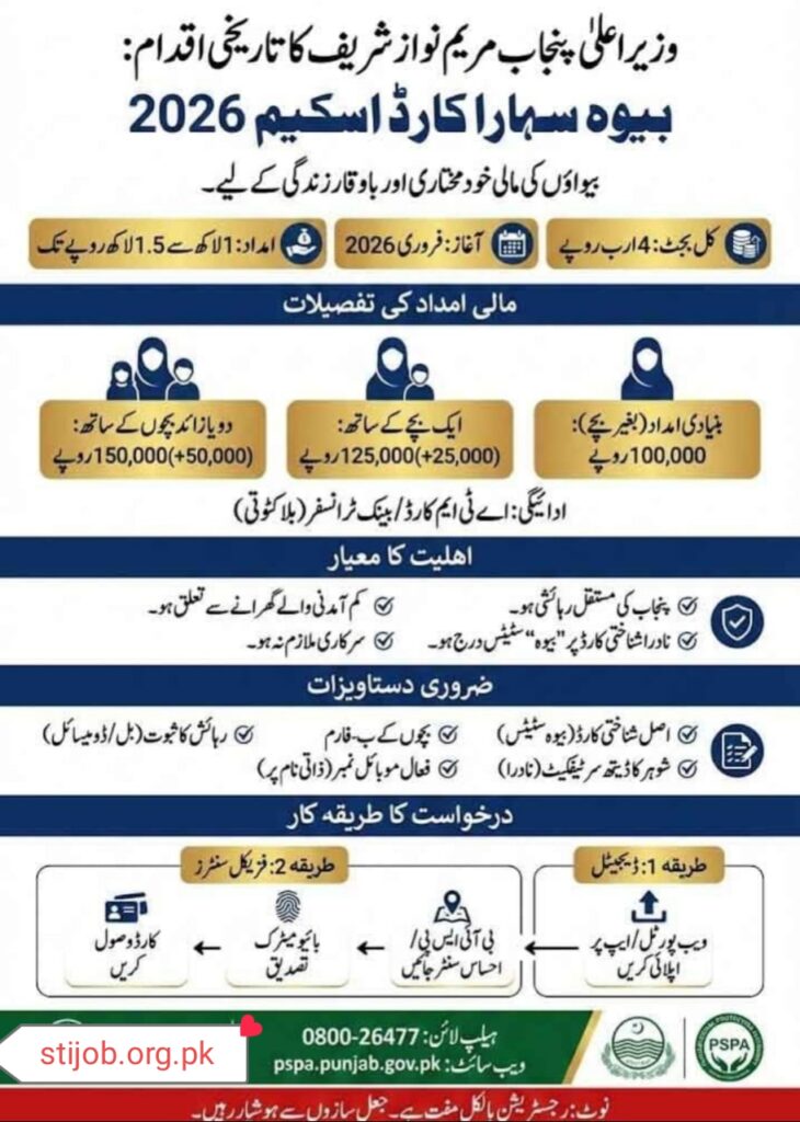 بیوہ سہارا کارڈ اسکیم 2026 ایک سماجی بہبود پروگرام ہے جسے وزیراعلیٰ پنجاب مریم نواز نے فروری 2026 سے شروع کیا ہے۔ یہ پنجاب کے کم آمدنی والے گھرانوں سے تعلق رکھنے والی بیواؤں کو ایک مرتبہ کی مالی گرانٹ فراہم کرتا ہے جو 100,000 روپے سے 150,000 روپے تک ہو سکتی ہے۔ ادائیگیاں اے ٹی ایم کارڈ یا بینک ٹرانسفر کے ذریعے بغیر کسی کٹوتی کے کی جائیں گی۔