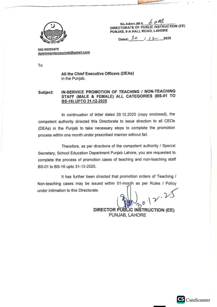 29.12.2025 کے خط کے تسلسل میں (کاپی منسلک ہے)، مجاز اتھارٹی نے اس ڈائریکٹوریٹ کو ہدایت کی کہ وہ پنجاب کے تمام سی ای اوز (DEAs) کو ہدایت جاری کرے کہ وہ بغیر کسی ناکامی کے مقررہ طریقے کے تحت ایک ماہ کے اندر ترقی کے عمل کو مکمل کرنے کے لیے ضروری اقدامات کریں۔