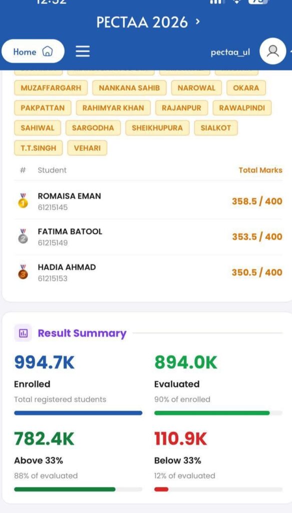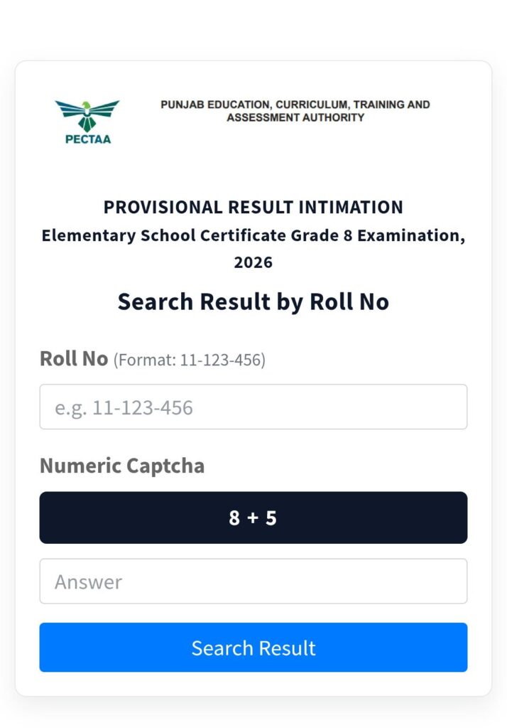 Madam CM’s Message for The Students of Grade 8=Alhamdulillah!Punjab’s Grade 8 Assessment 2026 results are out. This marks Punjab’s FIRST EVER AI-enabled, 100% machine-marked assessment.Nearly one million students appeared in the examination, with an overall pass rate of 88%, the HIGHEST EVER. The pass percentage stands at 83% for boys and an impressive 92% for girls.Results can be viewed on the PECTAA online portal from 3 PM onwards today: pectaa.edu.pk.I am immensely proud of the children of Punjab. Behind these numbers lie their hard work, the sincere dedication of our teachers, and the prayers of their parents.I remain committed to ensuring better learning, fairness, transparency, and equal opportunities for every child in Punjab.Congratulations to all my children 🇵🇰.