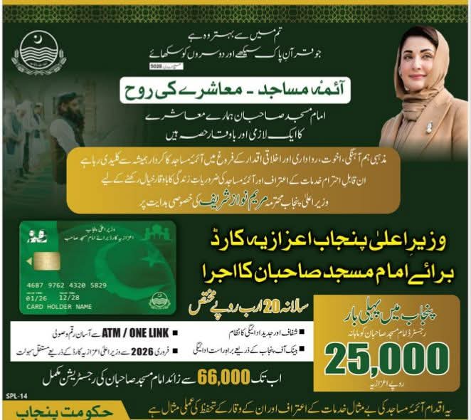 For the first time in the history of Punjab, the “Chief Minister of Punjab Honorary Card” has been issued for registered Imams of Mosques.