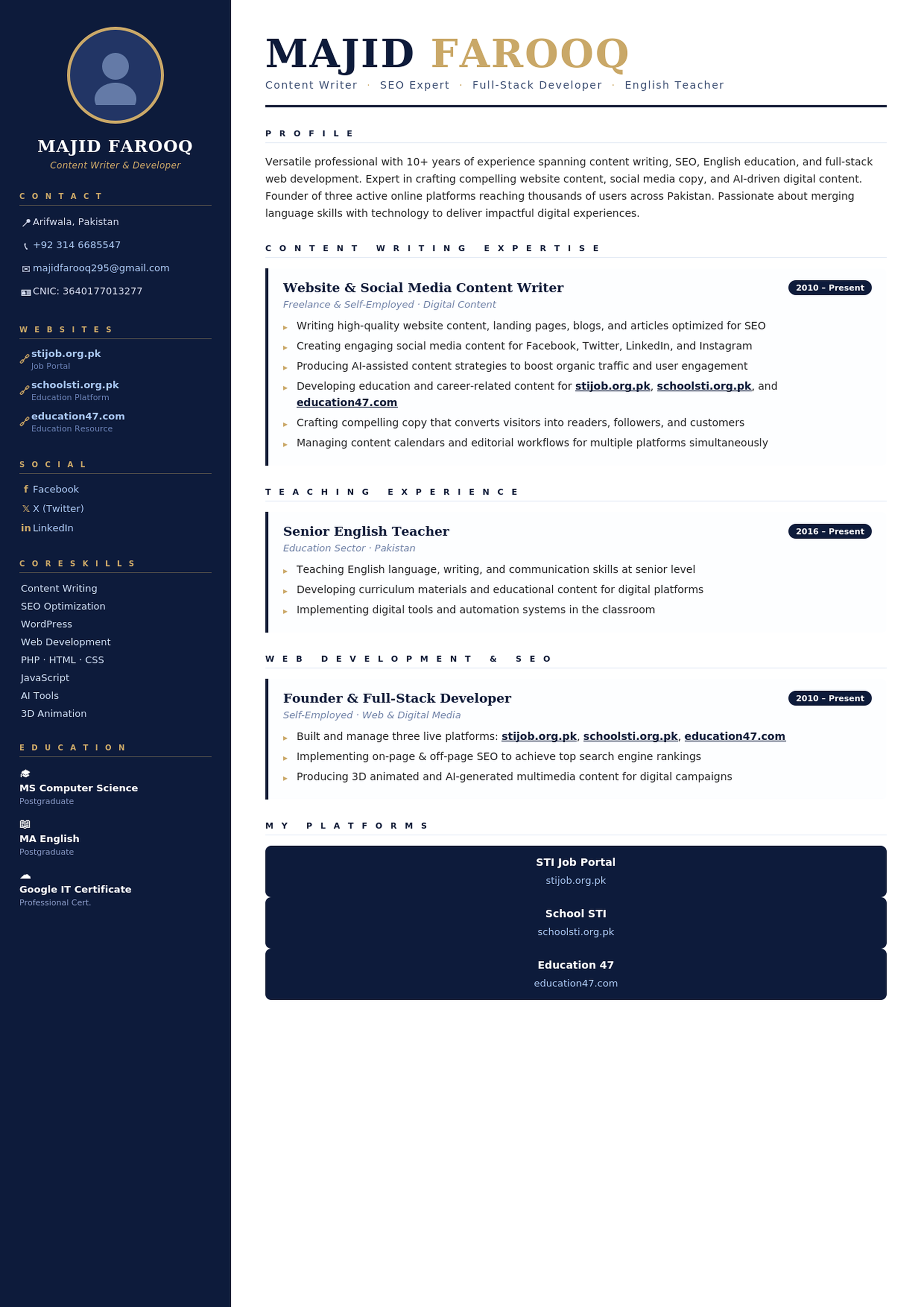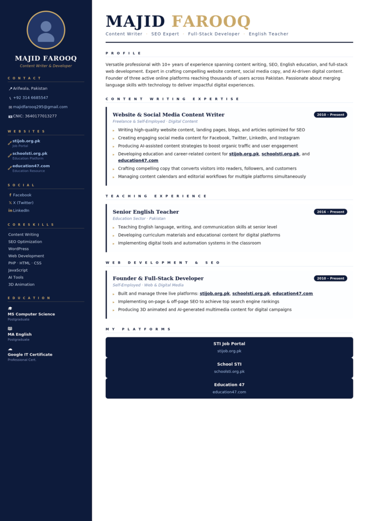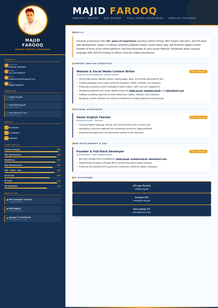 I am Majid Farooq, a multi-skilled professional based in Arifwala, Pakistan, with over 15 years of experience in content writing, English education, SEO, and full-stack web development. I bring together a strong command of the English language and deep technical expertise to create digital content that informs, engages, and converts.As a Website & Social Media Content Writer, I specialize in crafting SEO-optimized blog posts, landing pages, website copy, and social media content for platforms including Facebook, Twitter, and LinkedIn. I understand how to write for both human audiences and search engines — producing content that ranks, resonates, and drives results.As the Founder and Developer of three active online platforms — stijob.org.pkschoolsti.org.pk and education47.com.I have hands-on experience building, managing, and growing digital properties from the ground up. My work spans PHP, HTML, CSS, JavaScript, WordPress, AI-assisted content production, and 3D animation.As a Senior English Teacher since 2016, I have helped hundreds of students strengthen their communication and writing skills, blending traditional teaching with modern digital tools and automation systems.I hold an MS in Computer Science, an MA in English, and a Google IT Support Certificate — a combination that allows me to work confidently at the intersection of language, technology, and digital marketing.I am open to freelance content writing projects, SEO collaborations, and web development opportunities.📞 +92 314 6685547✉️ majidfarooq295@gmail.com🌐 stijob.org.pk | schoolsti.org.pk | education47.com