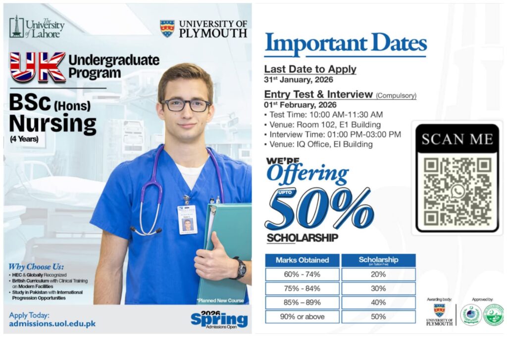The University of Lahore (UOL) and the University of Plymouth are teaming up to offer Pakistan’s first British Nursing Program!You can get a BSc (Hons) Nursing degree (that takes 4 years) from the University Of Lahore with this program in partnership with the University of Plymouth.* **Sector:** Private* **Last Day to Apply:** January 31, 2026* **Entry Test & Interview:** February 01, 2026* **Website:** [https://uol.edu.pk/](https://uol.edu.pk/)* **Apply Online:** [https://admissions.uol.edu.pk/](https://admissions.uol.edu.pk/)