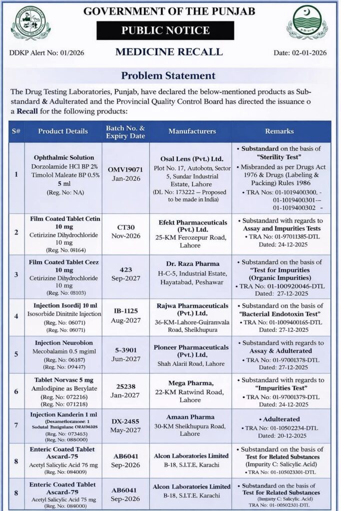 آٹھ ادویات جعلی مضر صحت قرار دے دی گئیں جن میں امراض قلب کی دوا بھی شامل ھے.