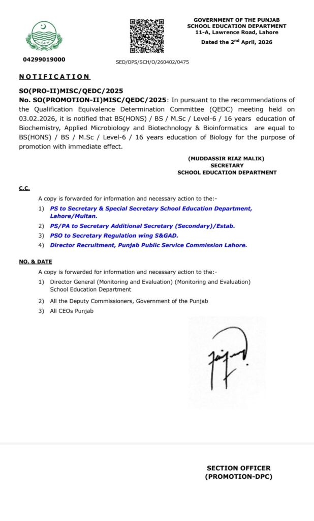 Equivalence for promotion April 2, 2026 by Majid Farooq Again MSC BS added for promotion.SED notification issued today.