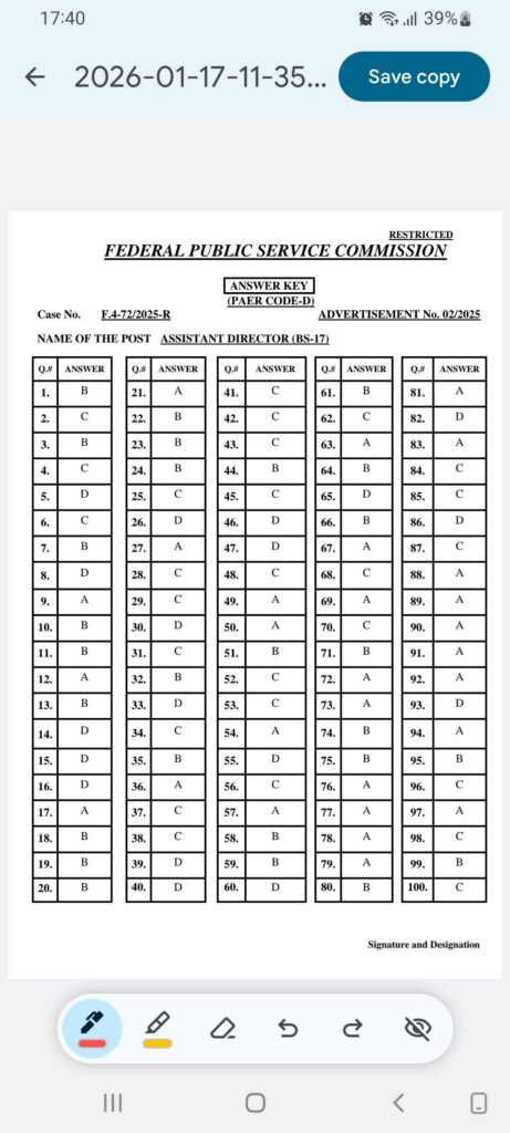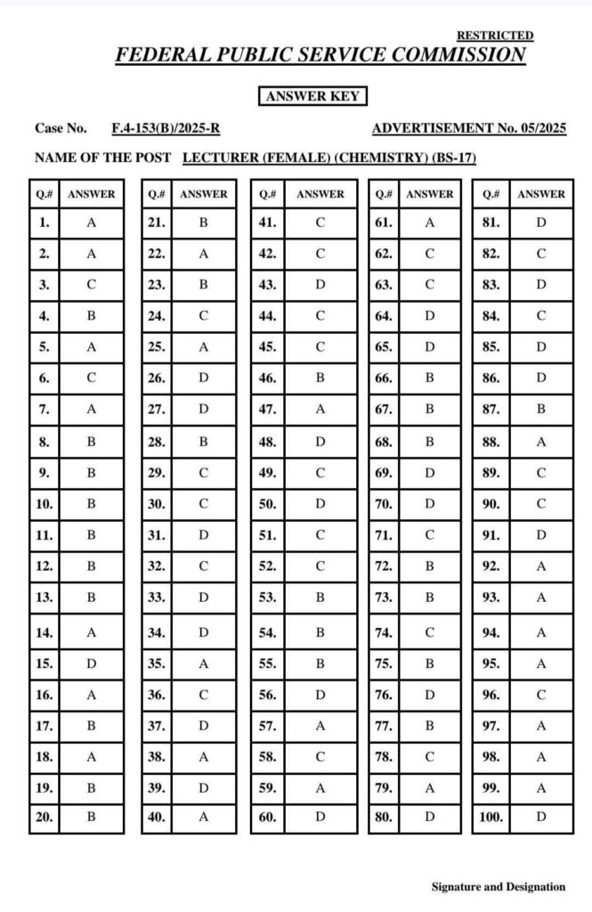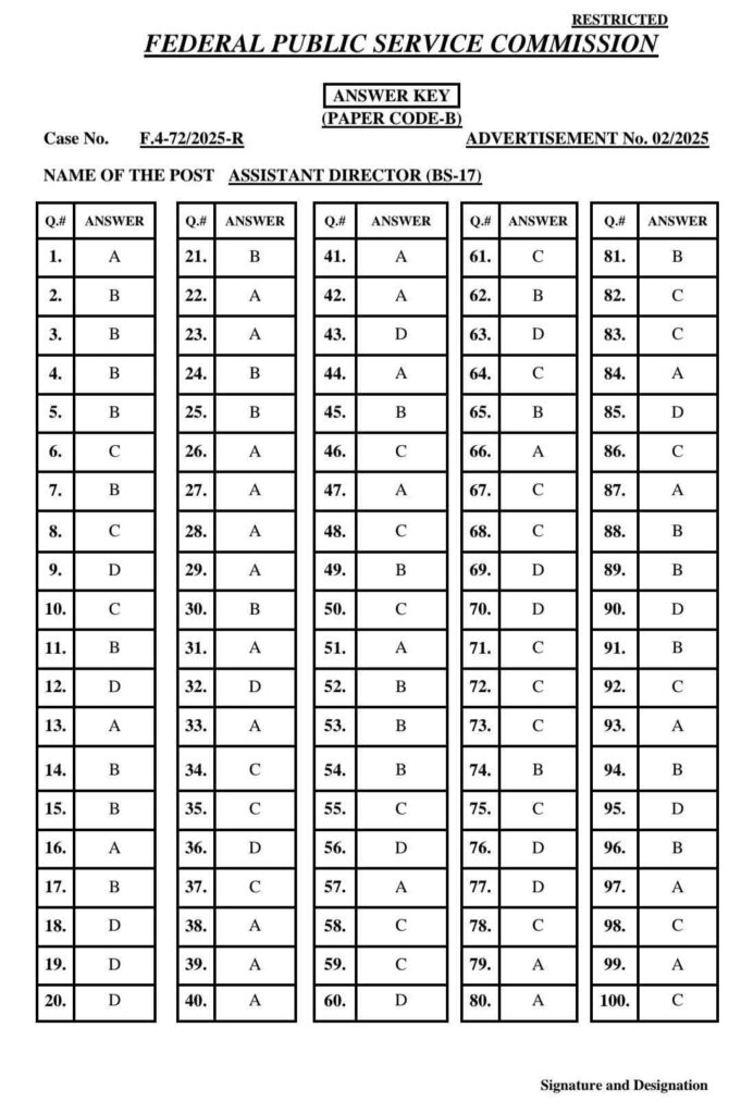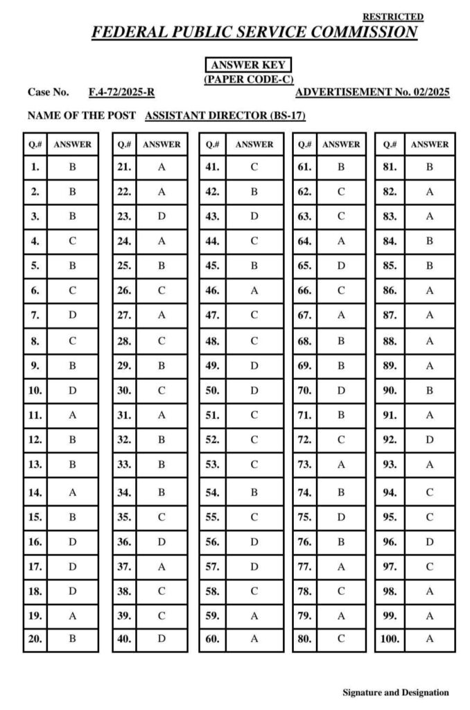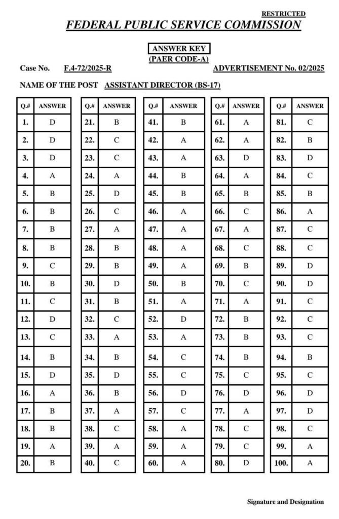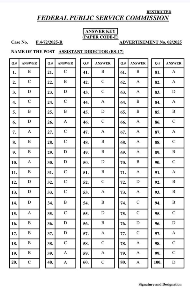 FPSC has uploaded the answer keys for the following Case Numbers:72/2025 (A to E) (AD ASF)