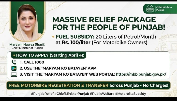 پنجاب کی وزیراعلیٰ کا بڑا اعلان کل سے “1000” پر کال کرکے اپنا موٹرسائیکل رجسٹرڈ کروائیں مہینے کا 20 لیٹر پیٹرول پر 100 روپے فی لیٹر کی رعایت ملے گی۔ یہ مہینے کا دو ہزار بنتا ہے جو آپکے بینک اکاؤنٹ ۔ ایزی پیسہ یا جاز کیش میں آیا کرے گا۔ اسکے علاوہ کل سے موٹرسائیکل کی رجسٹریشن اور ٹرانسفر فیس صفر کرنے کا اعلان
