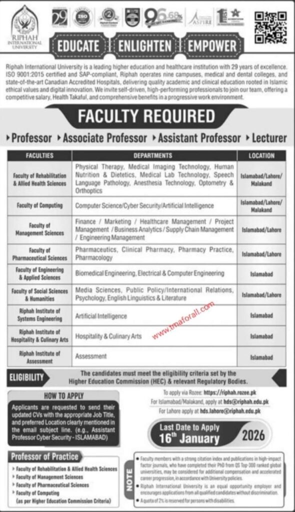 🎓* If you want to make a name for yourself in the field of education and research, Rafah International University welcomes you. Empty Vacancies : 🔹 Professor (Professor) 🔹 Associate Professor 🔹 Assistant Professor 🔹 Lecturer Departments: Computing (AI, Cyber Security), Management Sciences, Medical Sciences, Engineering, Social Sciences and others. 📍 Locations: Islamabad, Lahore, Malakand 📅 Last date to apply: January 16, 2026 ✅ How to apply? Send your updated CV (CV) with job title and location to the following email: 📧 For Islamabad/Malakand: hds@riphah.edu.pk 📧 For Lahore: Apply hds.lahore@riphah.edu.pk or online: https://riphah.rozee.pk Take advantage of this opportunity and share with your friends! 🤝