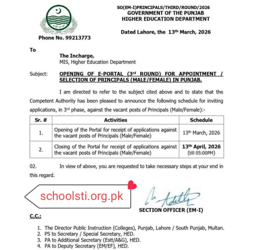 Higher Education Department Punjab has opened an e-portal for Principals (Male and Female).Applications can be submitted through HED Punjab Android App from 13 March 2026 to 13 April 2026 at 5 PM.