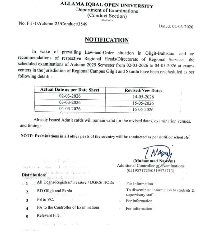 All remaining students’ papers will be as per the previously released date sheet.