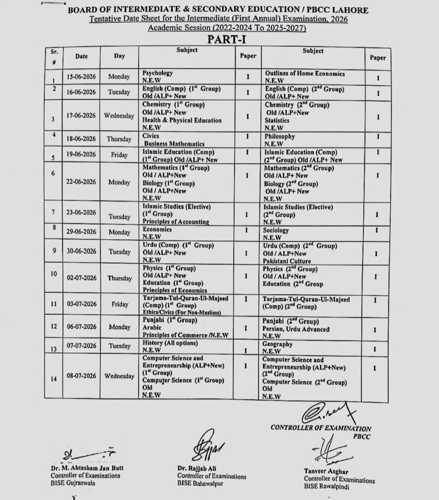 1st Year Tentative Date Sheet 2026 For all boards of Punjab