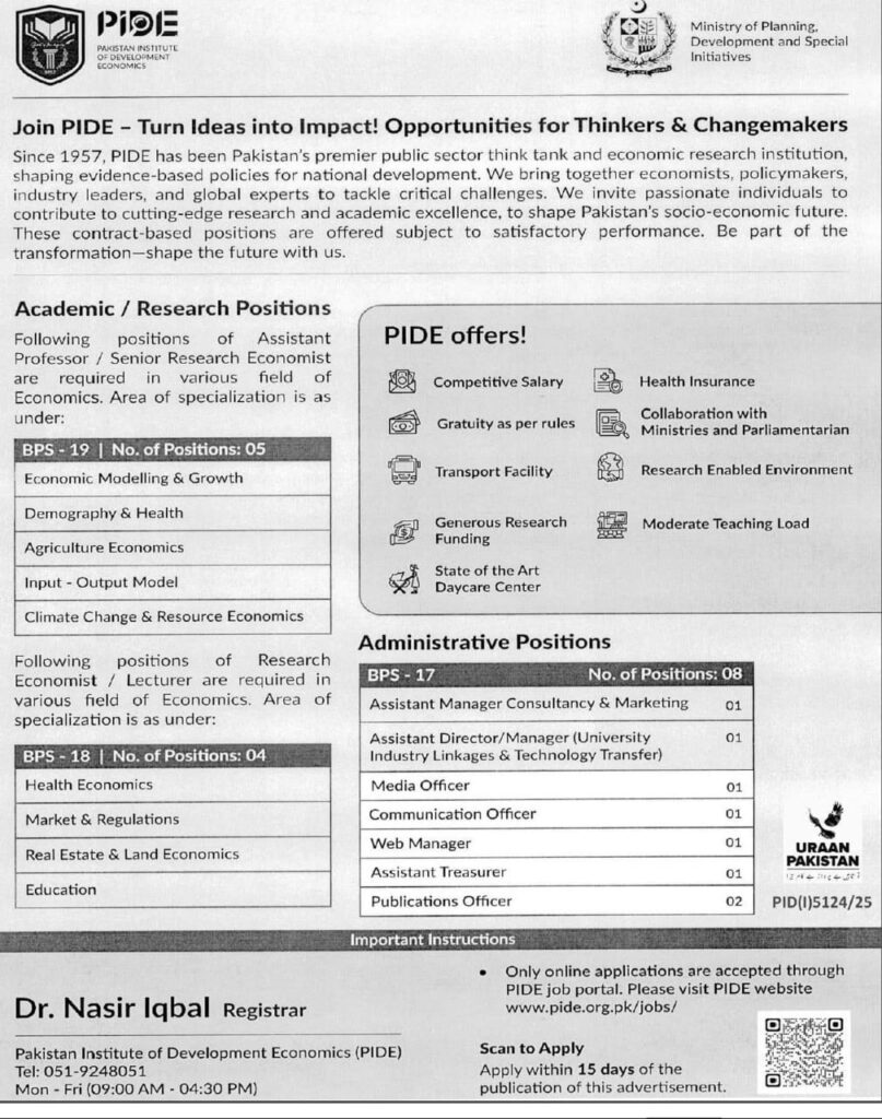 Since 1957, PIDE has been Pakistan’s premier public sector think tank and economic research institution, shaping evidence-based policies for national development. We bring together economists, policymakers, industry leaders, and global experts to tackle critical challenges. We invite passionate individuals to contribute to cutting-edge research and academic excellence, to shape Pakistan’s socio-economic future. These contract-based positions are offered subject to satisfactory performance. Be part of the transformation-shape the future with us.