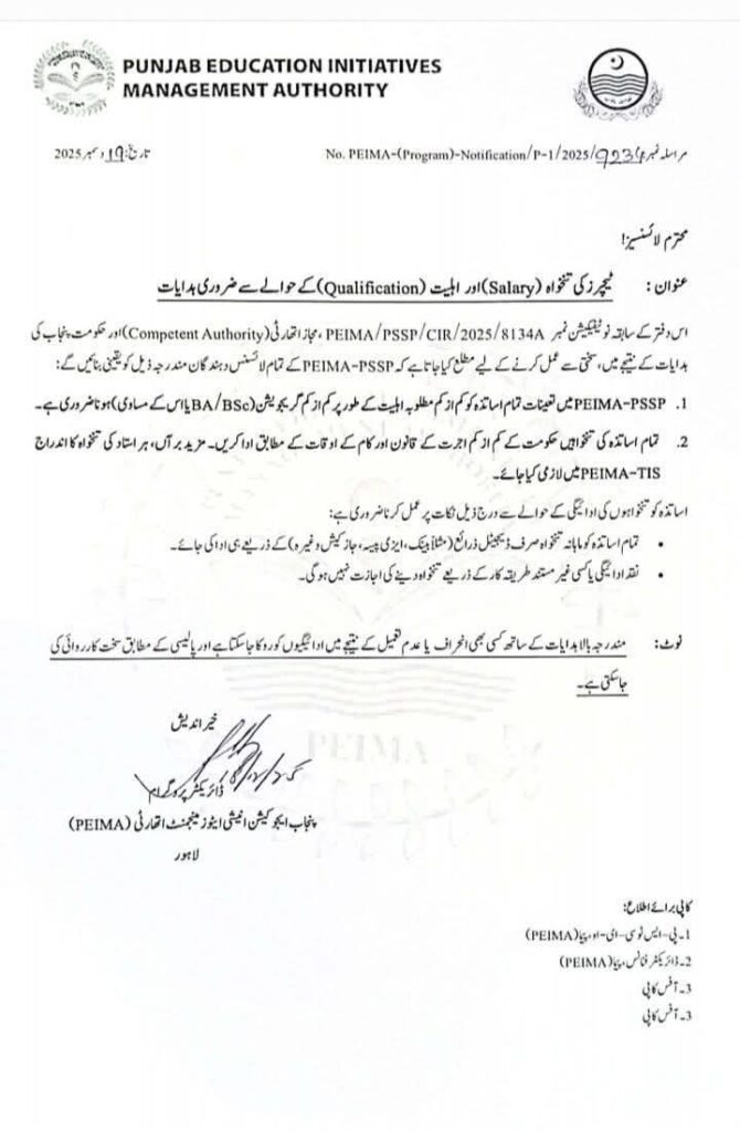 In pursuance of the previous notification of this office No. 2025/81344/PEIMA/PSSP/CIR, the directions of the Competent Authority and the Government of Punjab, it is hereby notified for strict compliance that all licensees of PEIMA-PSSP shall ensure the following: