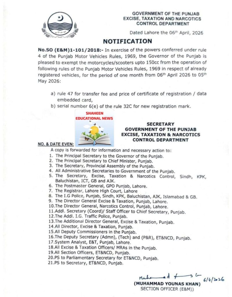 4 of the Punjab Motor Vehicles Rules, 1969, the Governor of the Punjab is pleased to exempt the motorcycles/scooters upto 150cc from the operation of following rules of the Punjab Motor Vehicles Rules, 1969 in respect of already registered vehicles, for the period of one month from 06th April 2026 to 05th May 2026: