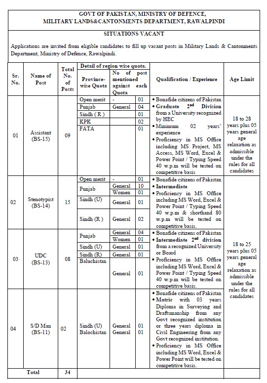بڑی خوشخبری! Ministry of Defence کے تحت Military Lands & Cantonments (MLC) میں مختلف آسامیوں کا اعلان 👇