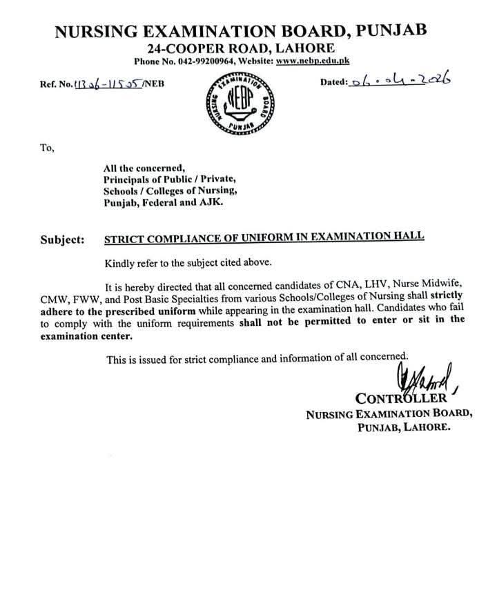 بذریعہ ہذا مطلع کیا جاتا ہے کہ نرسنگ کے مختلف سکولوں اور کالجوں سے تعلق رکھنے والے CNA، LHV، نرس مڈوائف، CMW، FWW، اور پوسٹ بیسک سپیشلٹیز کے تمام متعلقہ امیدوار امتحانی ہال میں حاضری کے وقت مقررہ یونیفارم کی سختی سے پابندی کریں گے۔