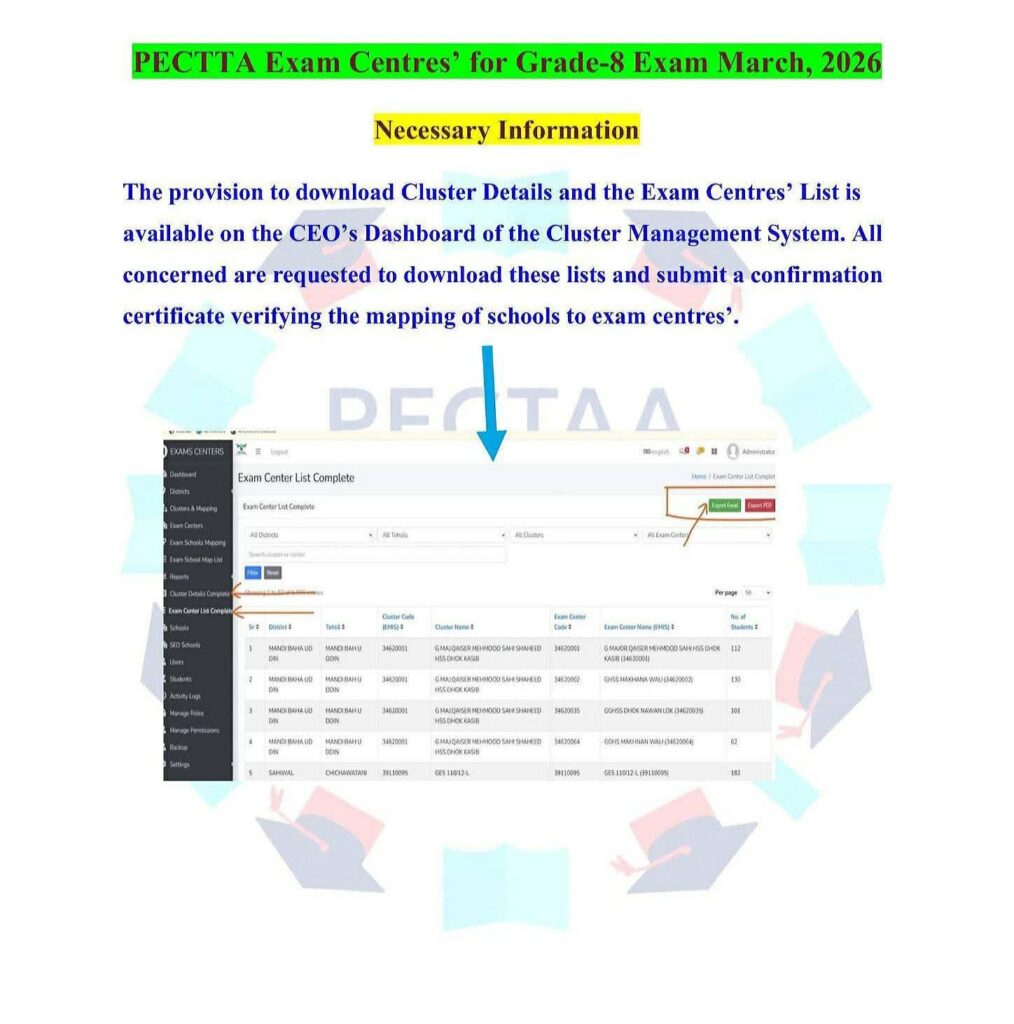 ☑️ کلسٹر مینجمنٹ سسٹم میں چیف ایگزیکٹو آفیسر (CEO) کے ڈیش بورڈ پر کلسٹر کی تفصیلات اور امتحانی مراکز کی فہرست ڈاؤن لوڈ کرنے کی سہولت دستیاب ہے۔
