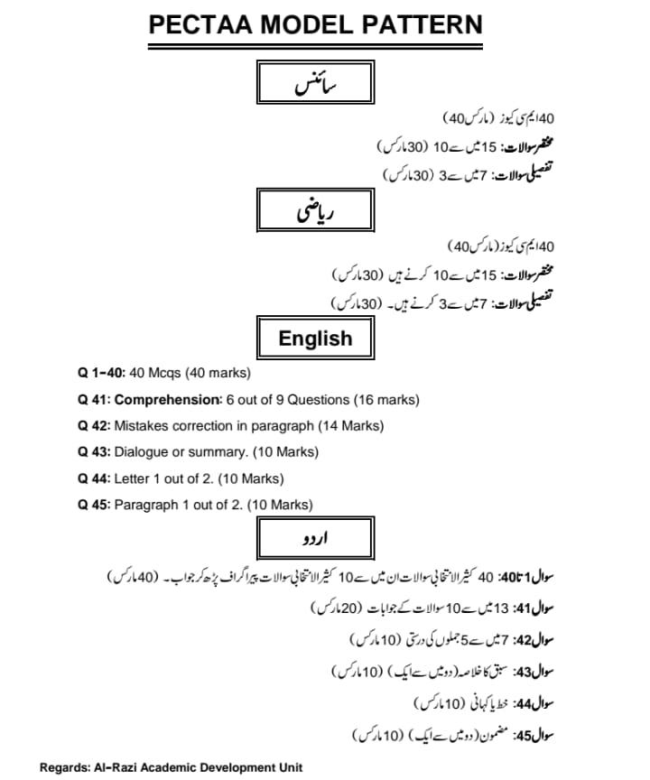 PECTAA BOARD EXAM 8thاس سال پیکٹا کا جماعت ہشتم کا بورڈ امتحان نہایت اہمیت کا حامل ہے اس سے پیف سکولز اور سرکاری سکولز کے رزلٹ کا موازنہ کیا جاۓ گا لہذا ہر سکول 100 فیصد رزلٹ کی کوشش کرے ، سب سے زیادہ توجہ کمزور سٹوڈنٹس پر دیں ان کو ضرور پاس مارکس حاصل کرائیں اس سال پیپر میں چوائس بہت رکھی گئی ہے مثلاً مختصر سوالات 15 میں سے 10 کرنے ہوں گے اور تفصیلی سوالات 7 میں سے 3 کرنے ہوں گے ۔ ہشتم کے ہر سٹوڈنٹ کو الرازی پیکٹا ماڈل پیپر سے تیاری کرائیں اور الرازی اسیسمنٹ گائیڈ، الرازی کنسپچوئل بک سے پیکٹا آئٹم بینک تیار کرائیں ۔