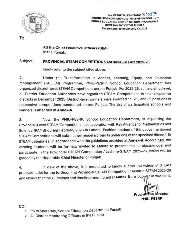 2. Now, the PMIU-PESRP, School Education Department, is organizing the Provincial-Level STEAM Competition in collaboration with Pak Alliance for Mathematics and Science (PAMS) during February 2026 in Lahore. Position holders of the above-mentioned STEAM Competitions will submit their models/projects under one of the specified fifteen (15) STEAM categories, in accordance with the guidelines provided at Annex-B. Accordingly, the winning students will be formally invited to Lahore to present their projects/model and participate in the Provincial STEAM Competition / Jashn-e-STEAM 2025-26, which will be graced by the Honorable Chief Minister of Punjab.