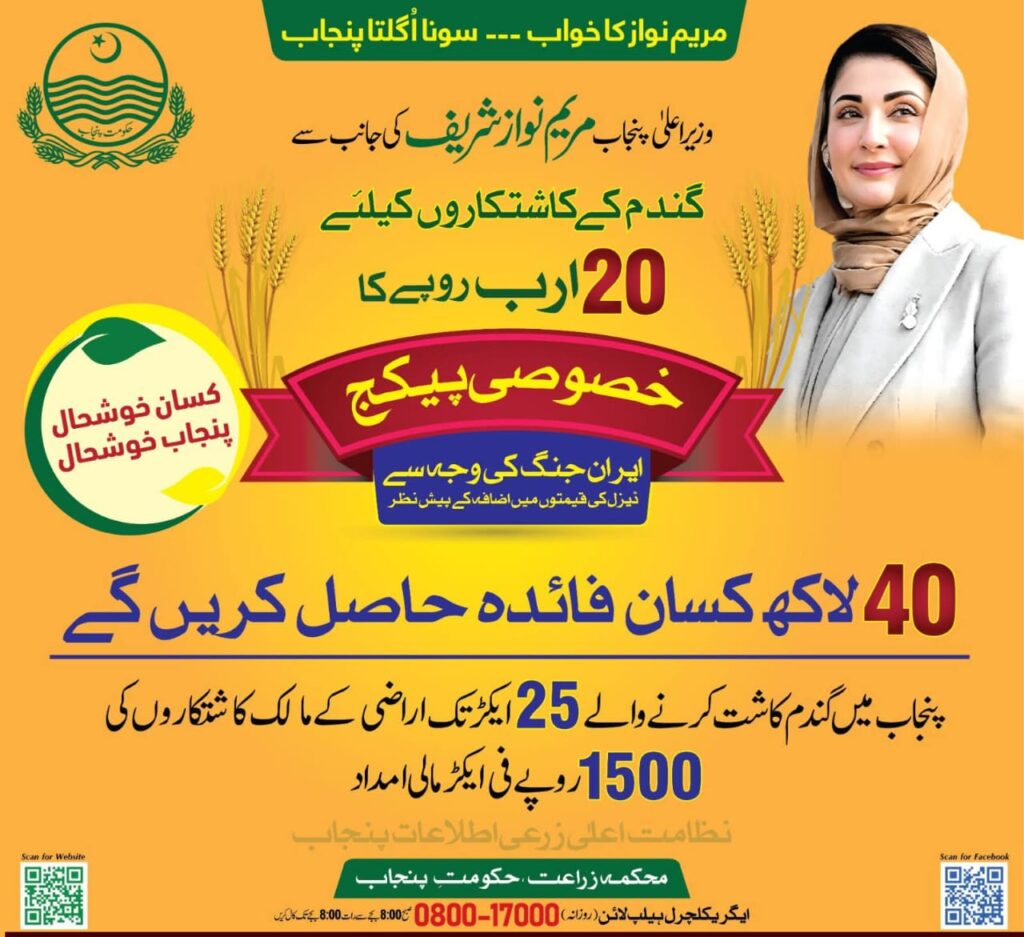 پنجاب میں گندم کاشت کرنے والے 25 ایکڑ تک اراضی کے 40 لاکھ مالک کاشتکاروں کی 1500 روپے فی ایکڑ مالی امداد