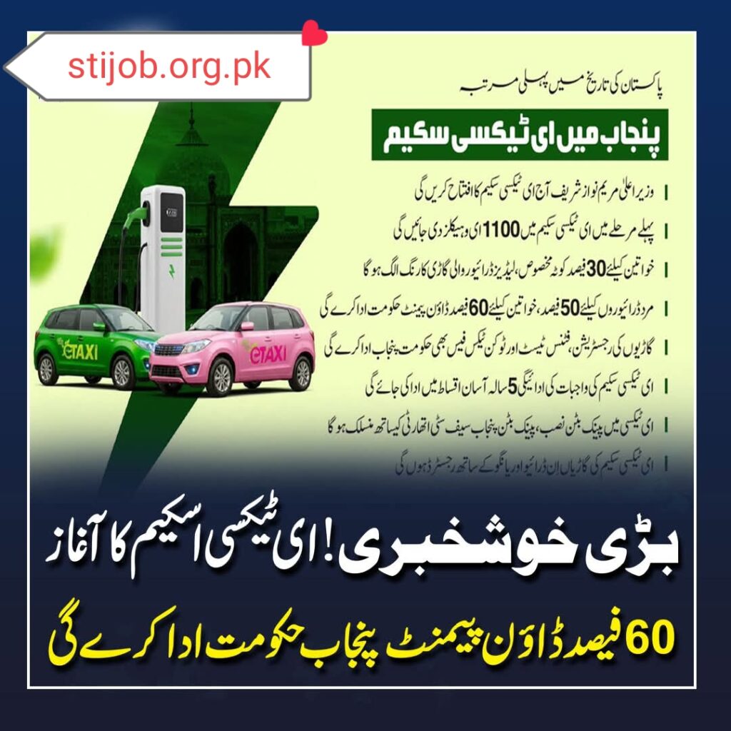 میٹا ڈسکرپشن: وزیرِ اعلیٰ مریم نواز کی تاریخی پنجاب ای-ٹیکسی اسکیم کے بارے میں جانیں۔ 60٪ تک ڈاؤن پیمنٹ سبسڈی، 5 سال کی آسان اقساط، اور خواتین کے لیے کوٹہ۔ ابھی پڑھیں!