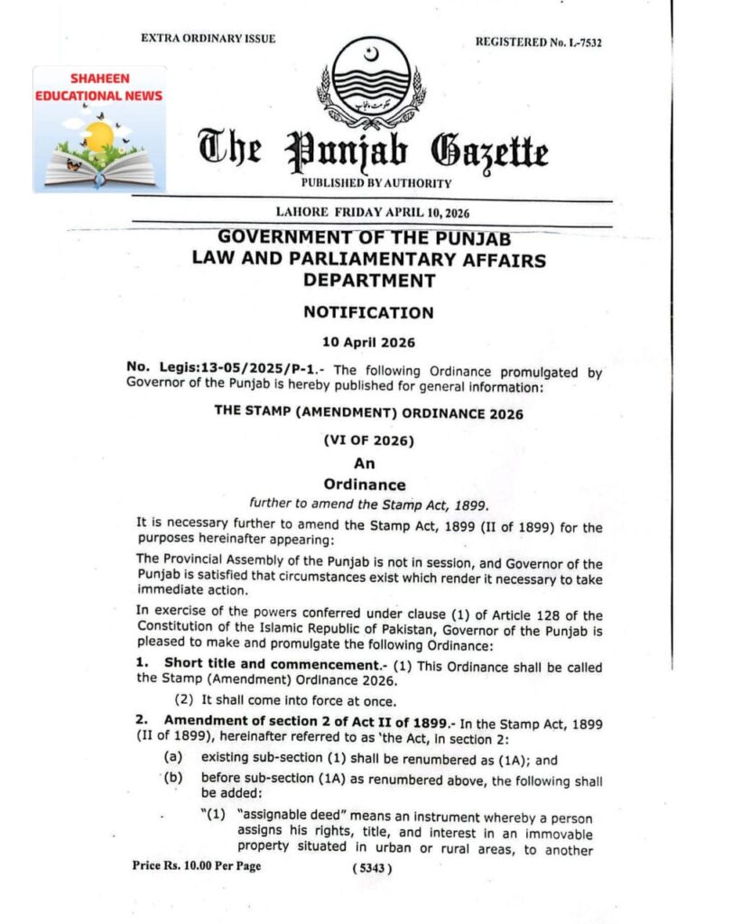 حکومتِ پنجاب نے سٹیمپ ایکٹ 1899 میں ترمیم کر کے Assignable Deed پر سٹیمپ ڈیوٹی کم کر دی: