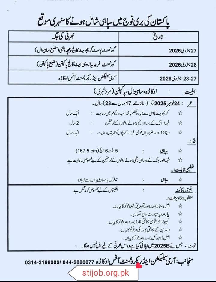 *اطلاع عام*پاک فوج میں بطور سپاہی بھرتی کا سنہری موقعپاکستان کی بری فوج میں بطور سپاہی بھرتی کے لیے *27 جنوری کو پوسٹ گریجویٹ کالج چیچہ وطنی (ڈگری کالج چیچہ وطنی)* ریکروٹمنٹ آفس اوکاڑہ کی موبائل ریکروٹمنٹ ٹیم بھرتی کرے گی اس سلسلہ میں شیڈول جاری کر دیا گیا،اہلیت رکھنے والے امیدوار 27 جنوری کو ڈگری کالج چیچہ وطنی میں کوائف کے ہمراہ تشریف لائیں