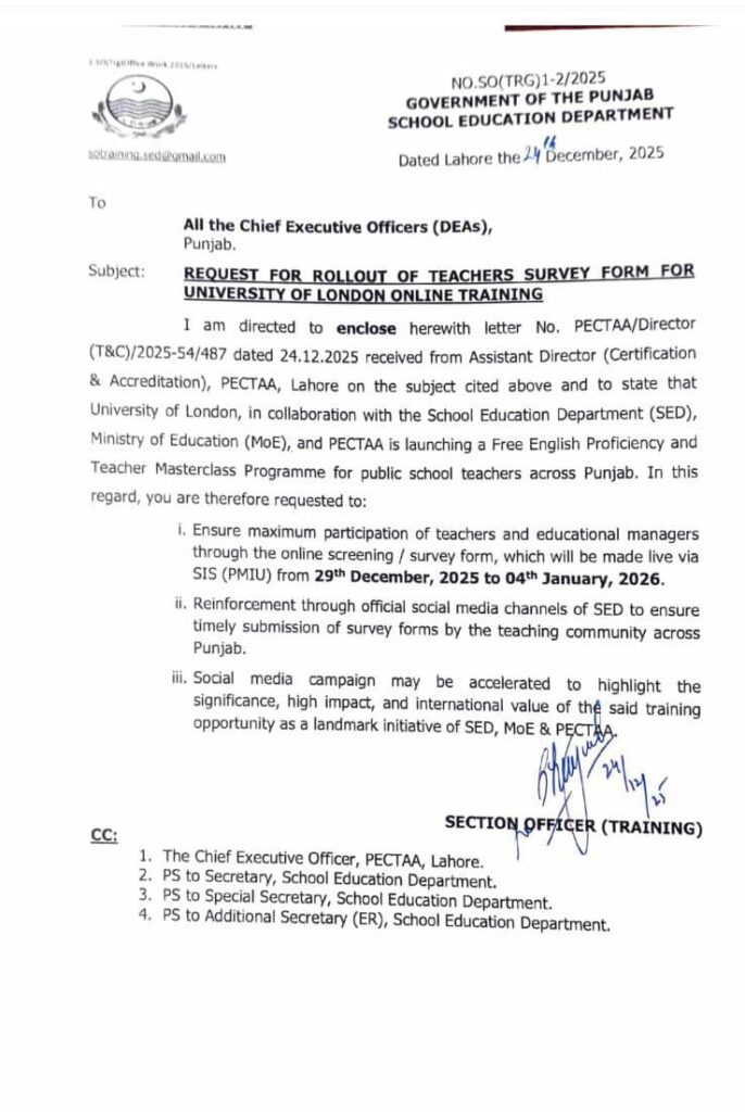 I am directed to enclose herewith letter No. PECTAA/Director (T&C)/2025-54/487 dated 24.12.2025 received from Assistant Director (Certification & Accreditation), PECTAA, Lahore on the subject cited above and to state that University of London, in collaboration with the School Education Department (SED), Ministry of Education (MoE), and PECTAA is launching a Free English Proficiency and Teacher Masterclass Programme for public school teachers across Punjab. In this regard, you are therefore requested to: