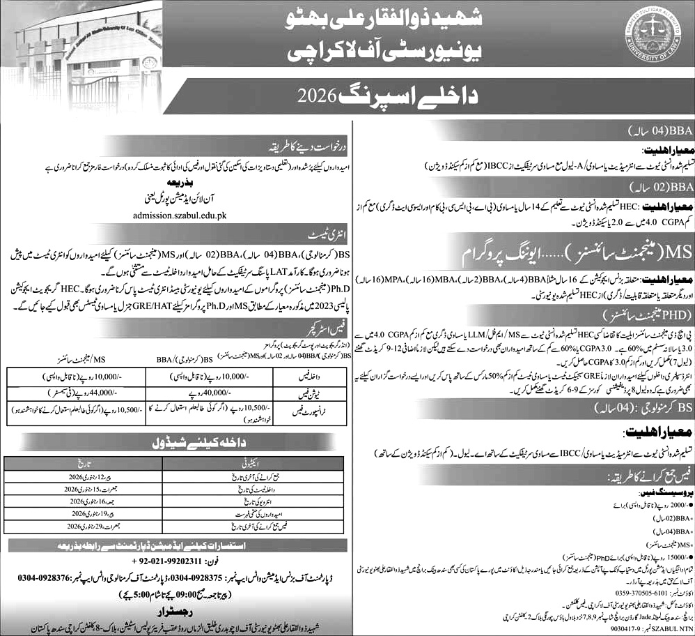 ♨️*Shaheed Zulfiqar Ali Bhutto University of Law (SZABUL), Karachi*Admissions Spring 2026◾*Sector:* Govt◾*Last Date to Apply:* 12 January, 2026◾*Entry Test:* 15 January, 2026◾*Details:* https://szabul.edu.pk/admissionannounce.html◾*Apply Online:* https://admission.szabul.edu.pk/`To Apply Online in any University and Entry Test, WhatsApp at` 03146685547*☆ Follow Our Whatsapp Channel for All Admissions Updates and Educational News👇🏻*
