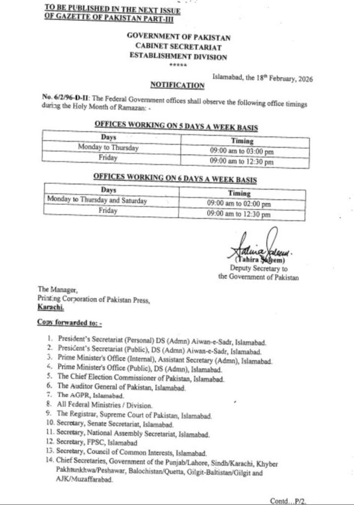 The federal government notification regarding the working hours of offices during Ramadan