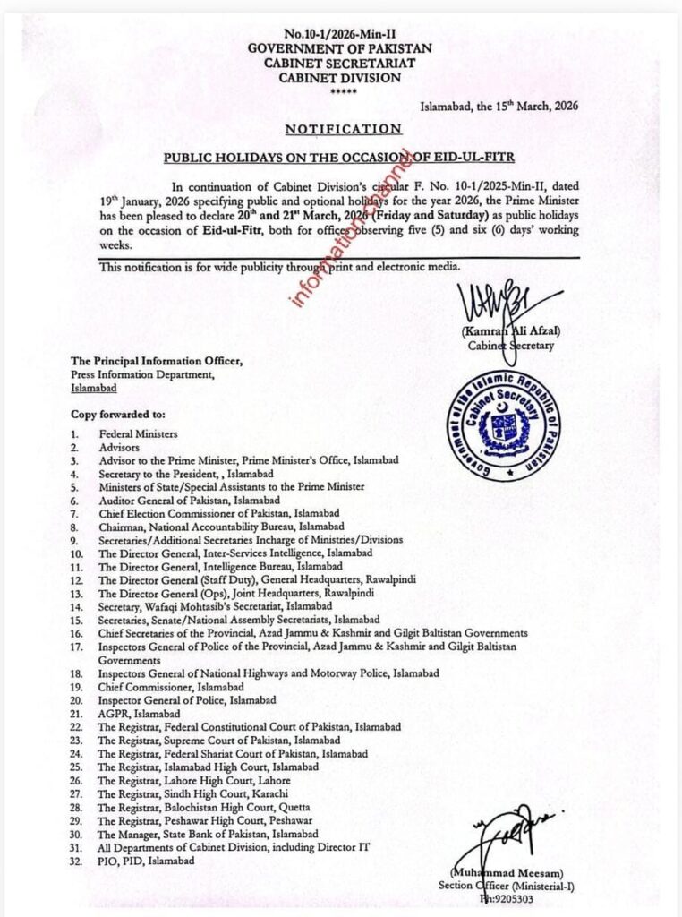 ہفتے میں پانچ یا چھ دن کام کرنے والے تمام دفاتر میں جمعہ اور ہفتہ کو عید تعطیلات ہونگی، نوٹیفیکیشن