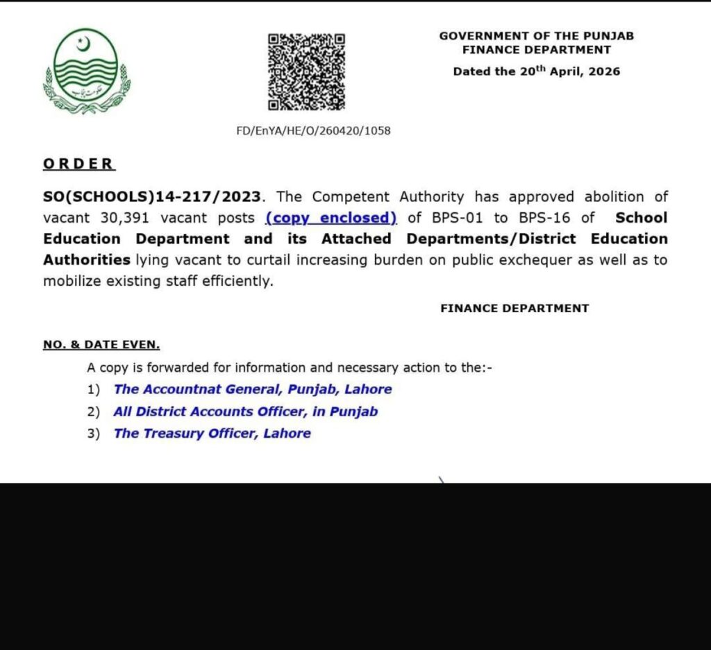 The Finance Department of the Government of Punjab has ordered the elimination of 30,391 vacant posts (BPS-01 to BPS-16) in the School Education Department and its affiliated offices.The decision is aimed at reducing the financial burden on the national exchequer and making better use of existing staff resources.