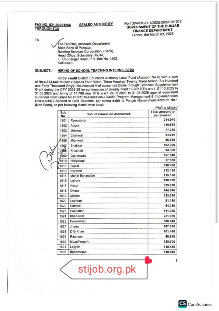 The Finance Department Punjab has released Rs. 5,300.00 million for STIs for 36 districts on 3rd March 2026. The funds are expected to be transferred to the respective DEAs within the next week, after which the payments will be disbursed to the STIs accordingly.