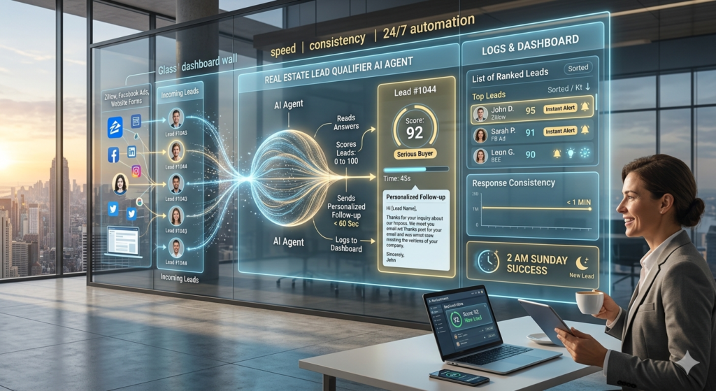 This is an automated system that sits between a real estate agent and their incoming leads. When someone fills out an inquiry form — from anywhere, whether that’s a Zillow profile, a Facebook ad, or the agent’s website — the agent springs into action without any human involvement. It reads the lead’s answers, scores them from 0 to 100 based on how serious a buyer they are, sends them a personalized follow-up email within 60 seconds, and logs everything to a dashboard. The realtor wakes up in the morning with a clean list of ranked leads and instant alerts for the best ones.