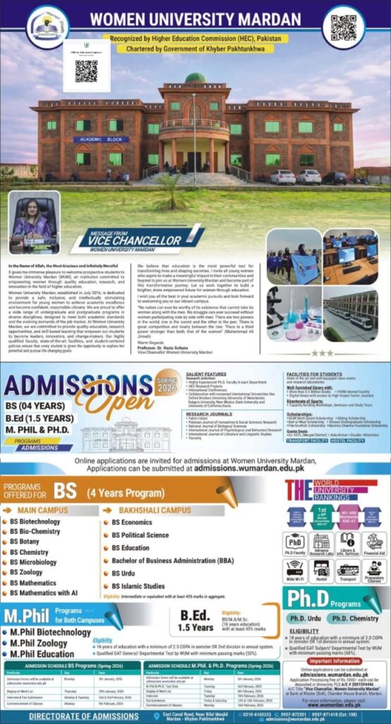 *Women University, Mardan*`Main Campus | Bakhshali Campus`Admissions Spring 2026*Sector:* Govt*Entry Test:* 03 February, 2026 (MPhil & PhD)